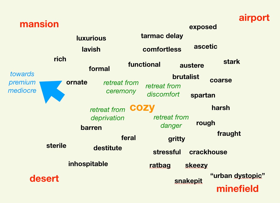 Venkat’s got a penchant for inventing his own neologisms, and spinning them out into grand societal theories. Here, he introduces a new one called domestic cozy, which he contrasts with a previous coinage, premium mediocre: